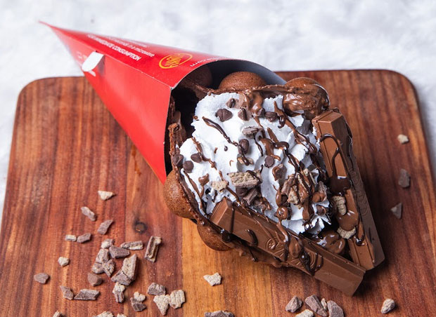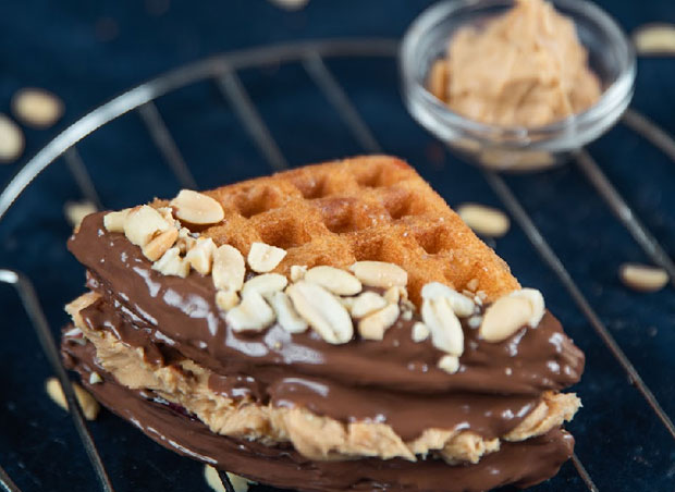 Crispy golden waffle with melted dark chocolateNUTTY PEANUT