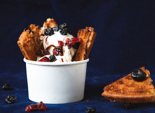 Crispy golden waffle with blueberry pulp and melted white chocolateVERY BERRY