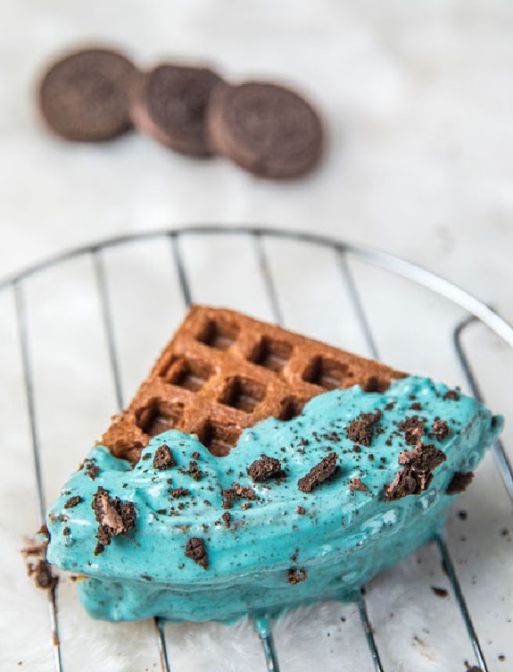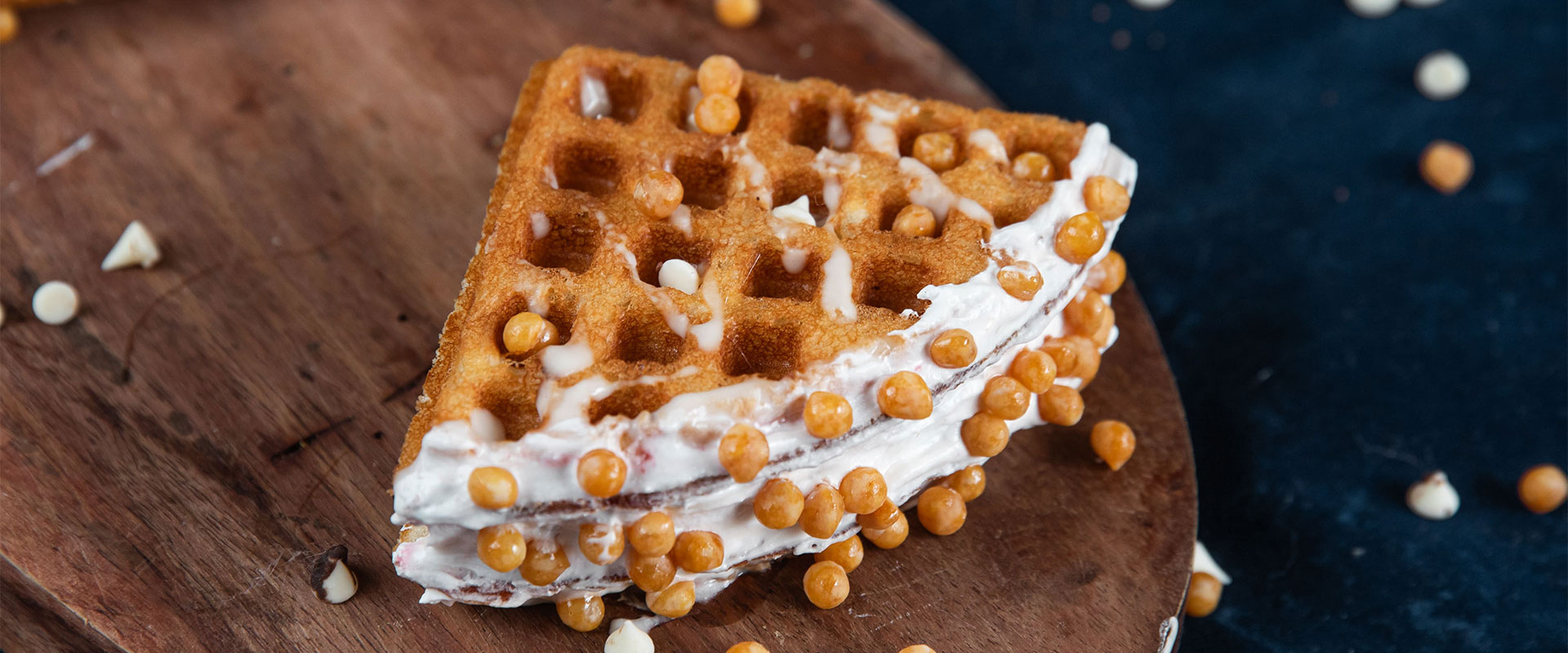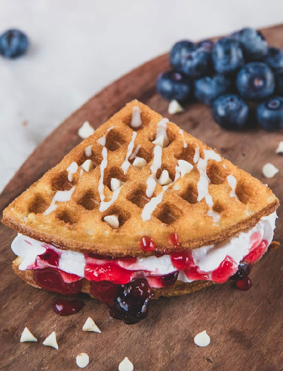 Crispy golden waffle with blueberry pulp and melted white chocolateVERY BERRY