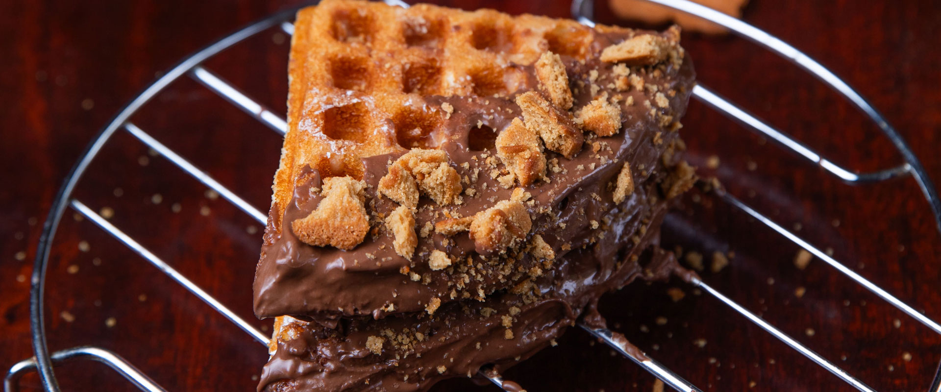 Crispy golden waffle with melted dark chocolateNUTTY PEANUT